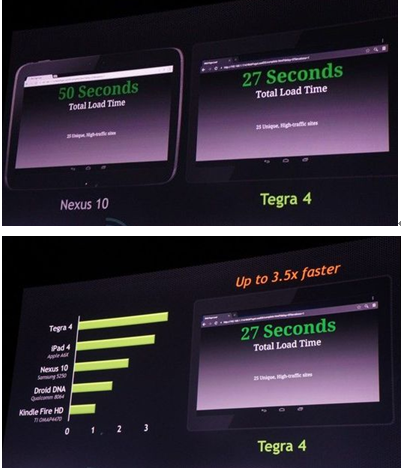 发布会现场,英伟达使用Tegra 4平板 和 Nexus 10进行了对比, 同时加载25个网页,Nexus 10耗时50秒。而采用Tegra4处理器的平板却只耗时27秒。