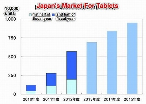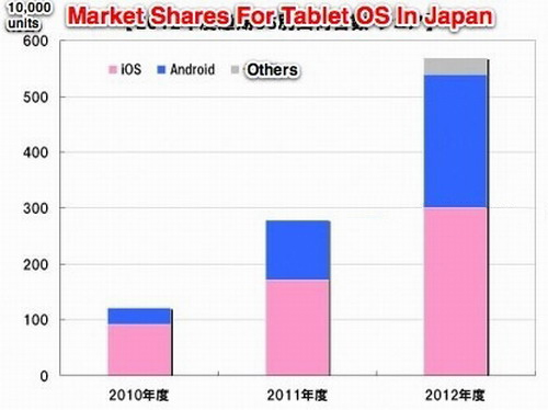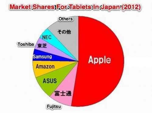 2012年,苹果日本分公司成功地发售了298万台iPad(注:包含iPad Mini),占据了52.5%的市场份额。排在苹果之后的是华硕,由于谷歌Nexus 7,使得华硕占据日本平板电脑市场份额第二。