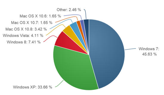 Windows 8和Windows 7的增长得益于Windows Vista和Windows XP的下滑。Windows Vista的份额从4.24%降至4.11%,Windows XP则大降3.53个百分点至33.66%,多年来首次跌破35%关口。
