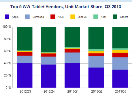 Helan 2013-10-31 08:52根据IDC公司最新公布的数据显示苹果在今年第三季度共计发售1410万台iPad,相比较第二季度环比下降50万台。而苹果的最大竞争对手三星的Android设备在本季度的出货量为970万台,位居第二。