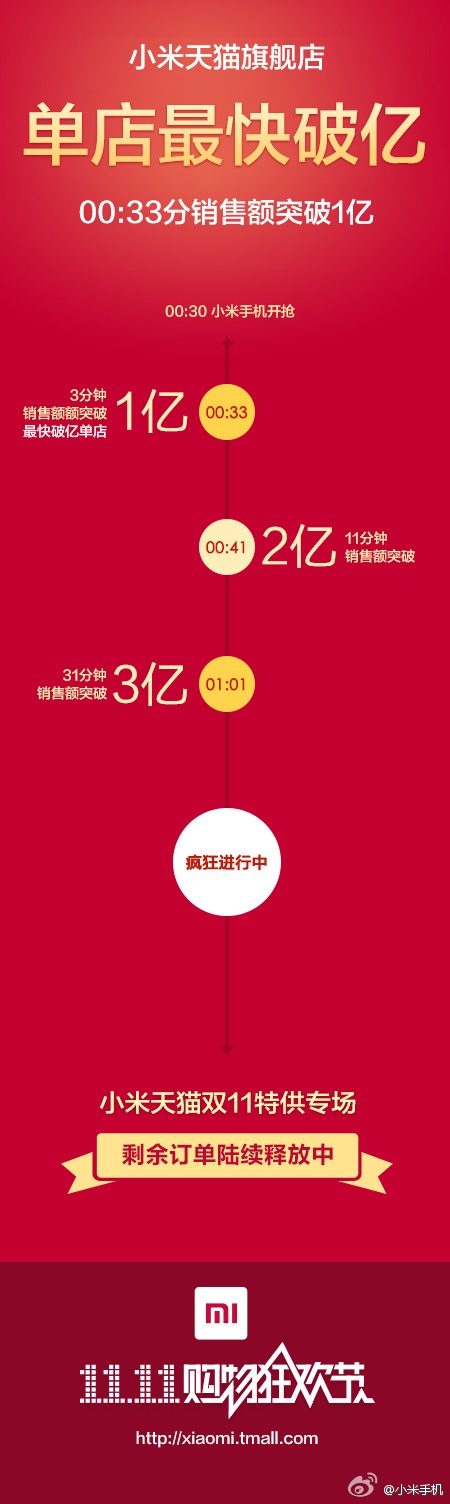 随后天猫发布公告称截止0点33分,小米官方旗舰店的成交额成功破亿,成为首个成交额破亿的商家,看来抢购成功后直接支付的用户确实不少。