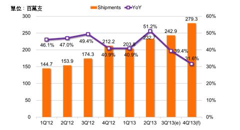2013年第3季全球智能型手机出货量2.4亿支,三星年增率最高,苹果新机开卖的效应递延到第4季才显现,估计其市占可望推升突破19%;受到与电信商合作机种库存影响,大陆一线业者第3季出货普遍衰退。