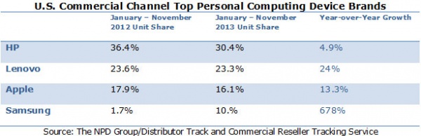 Helan 2013-12-26 10:02微软本月突然开始投放广告攻击Chromebook并不是真正的笔记本电脑,这令人非常疑惑,因为Chrome一直以来都是低调行事,设备数量也非常少,而NPD公布的数据则彻底让微软的动机真相大白。究其原因是,2013年11月,Chromebook系列产品已经占到所有商用笔记本销量的21%,如果算成PC和平板电脑总量,也有占了8%。