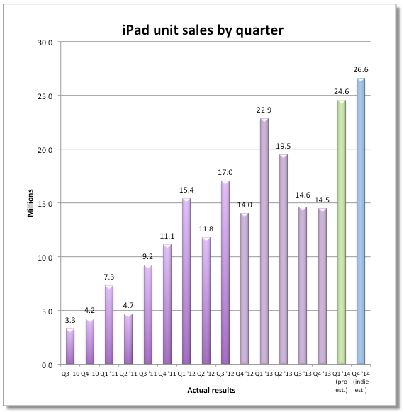 Helan 2014-01-23 09:28几天之前,Fortune网站总结了44位分析师对苹果上季度iPhone销量的预测,现在这些分析师又给出了对iPad销量的预测。结果显示,分析师们对上季度iPad销量预测的平均值为2500万,比去年同期增长10%。iPad销量预测难度很大,因为全新iPad Air直到11月1日才正式发售,错过了上季度三分之一的时间。全新Retina iPad mini的发售时间则等到了11月12日。