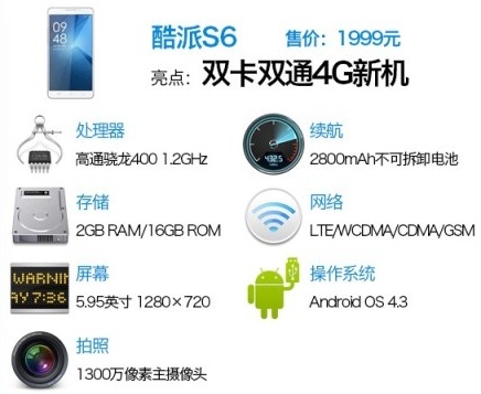 2月18日下午,酷派在北京正式发布了全球首款双卡4G手机—酷派S6。这款手机采用一块5.95英寸屏幕、高通A7架构四核处理器、2GB RAM+16GB ROM内存组合、后置1300万像素摄像头、支持4G网络和双卡功能,整体配置非常出色。据悉,该机售价1999元,本月24日接受预定,月底上市。