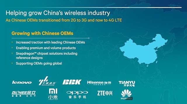 高通强调其协助中国 OEM 厂商从 2G、3G 迈入到 4G LTE 阶段,并且也与联想、华为、中兴、酷派、以及小米、OPPO 等中国厂商紧密合作。