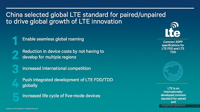 高通目标打造 LTE 无缝全球漫游,藉此降低设备成本,不必开发多个区域版本,同时推动全球 LTE FDD / TDD 融合,以及五模设备的发展。