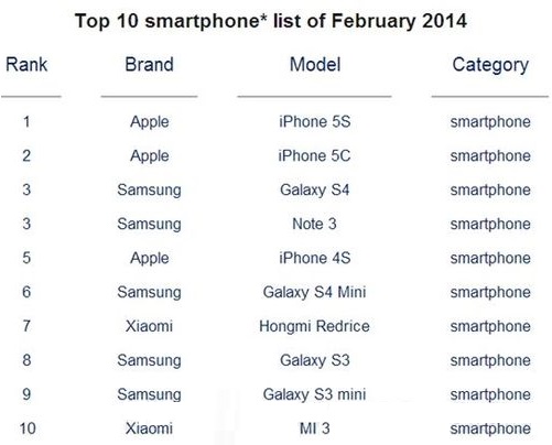 Helan 2014-04-04 08:39香港市场调查公司Counterpoint Technology Market Research近日公布了2014年2月份的全球手机市场销量报告。小米第一次杀入了全球前十名,而且一下子就有两款。