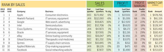 该报告来圣何塞水星报,数据基于彭博社和美国证券交易委员会的文件。尽管其收入和利润处在领导地位,但在投资者方面,苹果的市值只是惠普、谷歌、英特尔和思科总市值的约70%。其中谷歌的收入和利润只有苹果的三分之一,但是市值仅比苹果低五分之一。