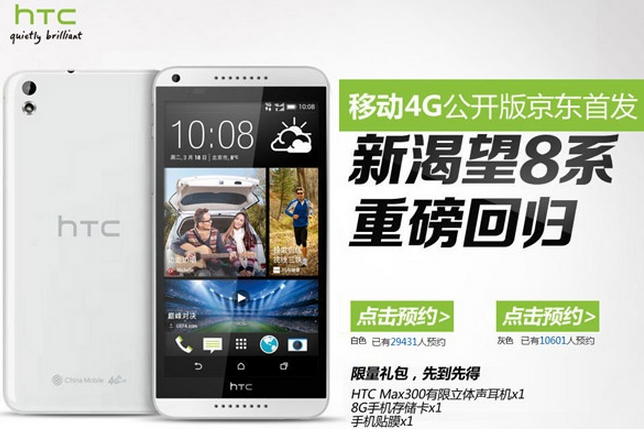 Helan 2014-04-18 15:524月18日,HTC Desire 816t移动4G版(非合约机)正式在京东开放预约,将于4月22日正式开售,该机支持移动TD-LTE 4G网络、TD-SCDMA 3G网络,也支持GSM网络。