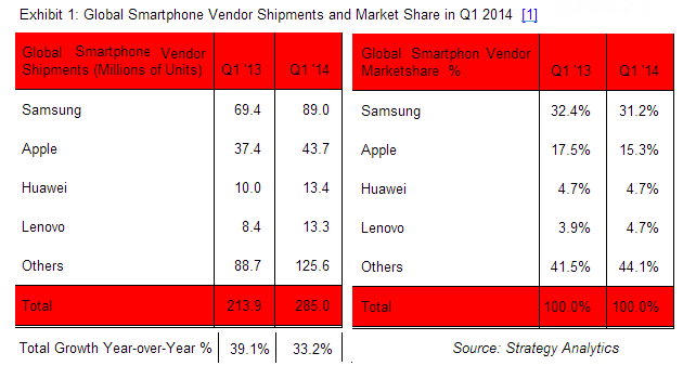 Helan 2014-04-30 09:16虽然三星官方不会公布手机出货量,分析机构Strategy Analytics发布报告,称三星今年第一季度的手机出货量达到了8900万,比去年同期增长2000万。三星官方公布的报告显示,今年第一季度相比去年同期,利润降低了3.3%。三星表示平板电视和高端智能手机销售不景气导致运营利润下滑。