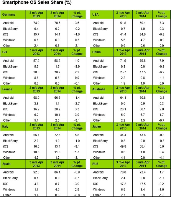 此外,Windows Phone 在全球多个地区的份额也获得了小幅增长,包括德国的 6.9%,英国 9.5%,法国 10.1%,西班牙 4.6%,日本 1%。不过,最新数据显示 Windows Phone 在美国的市占率仅为 4.7%,低于 3 月份的 5.6%,且比去年同期的 5.3% 也有所下滑。