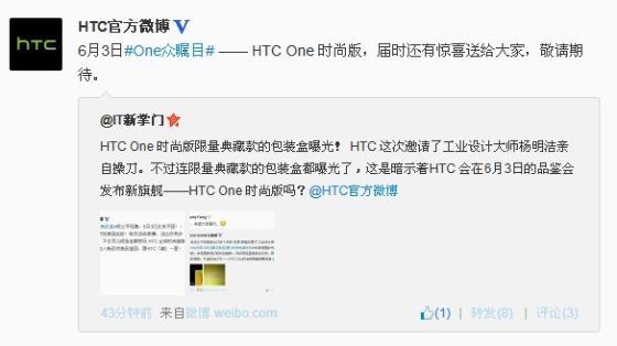 Helan 2014-05-28 09:15近来关于HTC新品One时尚版的猜测不断,27日晚间,HTC官方终于给出明确表态,确认即将发布One时尚版,并且透露将会在6月3日的时尚品鉴会上正式公布这款新品的具体参数和价格信息。关于One时尚版的参数和价格业界早有爆料,上周曝光双曲线设计后,本周媒体再次泄露这款新品的全参数,5英寸的1920*1080P高清大屏,搭载高通骁 龙801四核2.5GHz处理器,前后摄像头分别是500万像素和1300万像素,总体配置水平属于高端旗舰,且和三星S5相同。