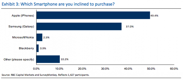 Helan 2014-06-25 08:59加拿大皇家银行资本市场(RBC Capital Markets)发表报告,报告中提到消费者对苹果下一代 iPhone 的需求非常强烈,虽然现在距离秋天的 iPhone 发布会还有几个月的时间。根据4000人参与的调查,计划在未来三个月内购买智能手机的用户中,有一半有意向购买 iPhone,而四分之一用户表示,如果 iPhone 6的屏幕为5.5寸,则愿意多支付100美元。