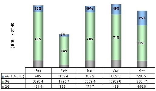 根据大陆工信部的统计,合计2014年1月~5月大陆整体手机出货量仅1.78亿支,相较去年同期出货量减少逾7,000万支,其中2G手机出货量的下滑幅度更高达77%。主要原因在于中国移动为加速4G TD-LTE手机销量减少2G/3G手机补助,以及中国联通与中国电信未获FD-LTE营运牌照而出现4G业务推广的时间断层。