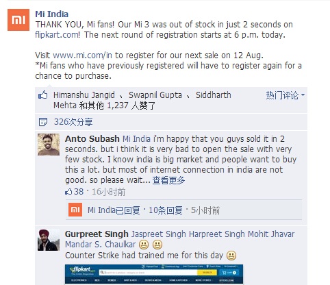Helan 2014-08-06 11:3515000部小米3手机在印度开卖,仅2秒钟就全部售罄,这应该是创造了小米手机史上最快售罄速度的记录。小米印度Facebook账号不久前发布消息,晒了一下小米3在印度的销售成绩单(图2):谢谢米粉们!flipkart.com上的小米3在2秒钟内就售罄了。下一轮抢购的注册从今天下午6点开始。flipkart.com是和小米合作的印度电商网站。