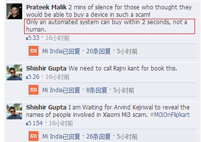 15000部小米手机在2秒钟内售罄无疑创造了一个记录。在国人自豪于国产品牌小米在海外为中国人“挣脸”之时,却有外国网友在小米印度Facebook账号上留言质疑(图3):“2秒抢完15000部手机,这只有自动抢购系统才做得到吧,反正人工做不到。”