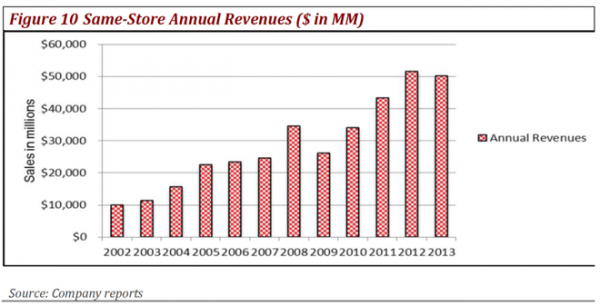 今年第二季度,同一家的零售店营收同比下降了4.9%。自2013年3月开始,Apple Store 的营收就出现了下滑。iPhone 和 iPad 是 Apple Store 营收的主要贡献者,虽然目前整体营收下降,但 Mac 的增长势头依然很明显。今年第二季度,同一家 Apple Store 的 Mac 销量同比上涨了11%,而非 Mac 产品的营收下降了8.8%。对于 Wolf 来说,他认为数据显示, Apple Store 非 Mac 产品的增长已经达到极限。