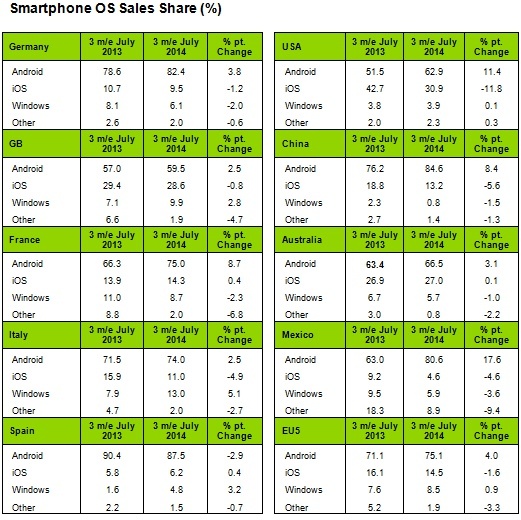 在这份报告中,英国市场的 Windows Phone 销量再次获得增长,份额占到了9.9%,而在意大利,Windows Phone 的份额更是盖过 iOS,达到了13%。在西班牙,尽管截止 7 月份的 4.8% 份额要低于上一季度统计的 7.5%,但整体的市场份额正在逐年递增。相反,在法国和德国市场,Windows Phone 的份额明显下降,考虑到 Lumia 930 上市稍晚而缺乏销售引力,因此这样的结果不算太意外。