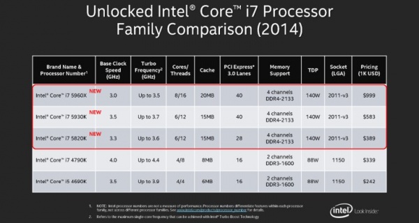从下面的系列对比图中看到,新的Haswell-E处理器不仅仅在PCI-E通道、物理核心和缓存上有改进,而且支持四通道DDR4-2133内存。i7-5820K起价389美元。