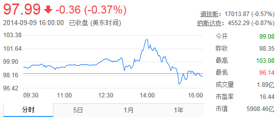 苹果(美东时间) 2014-09-09开盘报99.08美元,股价上涨0.73%,在早间交易时段,苹果股价一直呈现小幅上升态势,12:27:53苹果股价突破100美元,14:00之后该股出现大幅回落。在苹果CEO蒂姆·库克公布iPhone 6与iPhone 6 Plus两款手机后,股价开始回升,成交量增加,新公布的支付功能Apple Pay更是给投资者带来信心。不过,截至收盘苹果股价报收97.99美元,依然较开盘价下跌0.36美元。在盘后交易时段,继续小幅下跌0.13%,报收97.86美元,市值达5889.70亿美元。