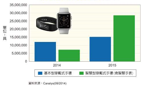 2015年穿戴式手环将大幅成长。市调机构Canalys指出,苹果Apple Watch明年初上市后,可望为穿戴式手环市场注入强劲成长动能,预估2015年相关产品出货量将达四千三百二十万具,较2014年大增129%;其中,可执行第三方应用程式的智慧型手环占比达65%,约二千八百二十万具,为主要的成长来源。