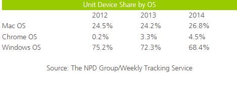Windows台式机也在今年的返校季节中延续以往的成功,其销售量比去年同期增长2%,与2013年返校季节中的同比下滑2%相比有重大改善。Chromebook销售量在今年返校季节中同比增长32%,在笔记本销售量中所占比例超过了5%,在售价300美元以下的笔记本销售量中所占比例达18%。