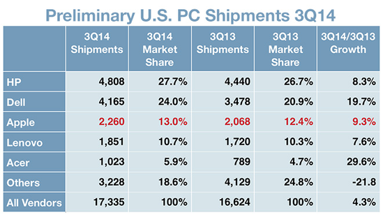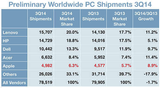 以下是苹果以外几大PC生产商在今年第三季度的预估出货量表现: