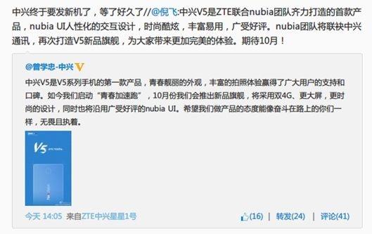 曾学忠在微博中提到:中兴V5是V5系列手机的第一款产品,青春靓丽的外观,丰富的拍照体验赢得了广大用户的支持和口碑。如今我们启动“青春加速跑”,10月份我们会推出新品旗舰,将采用双4G、更大屏,更时尚的设计,同时也将沿用广受好评的nubia UI。希望我们做产品的态度能像奋斗在路上的你们一样,无畏且执着。
