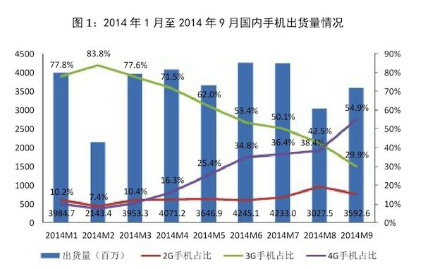 2014年9月,全国手机市场整体出货量为3592.6万部。其中,2G手机出货量为547.7万部,3G手机出货量为1074.1万部,4G手机出货量为1970.8万部。