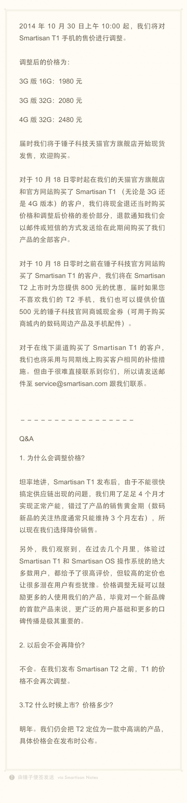 对于10月18日0点以后在天猫旗舰店和官方网站购买了Smartisan T1的用户,锤子科技将退还调整后的差价,退款通知会以短信或邮件方式送达。