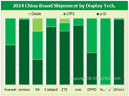 据CINNO Research预估,2014年小米LTPS/Oxide面板使用比重将达62%,华为LTPS使用比重将达40%,而被业内誉为闷声赚大钱的OPPO该比重也将达52%。中兴在Nubia系列的支持下,LTPS与Oxide面板使用比重合计将达19%。