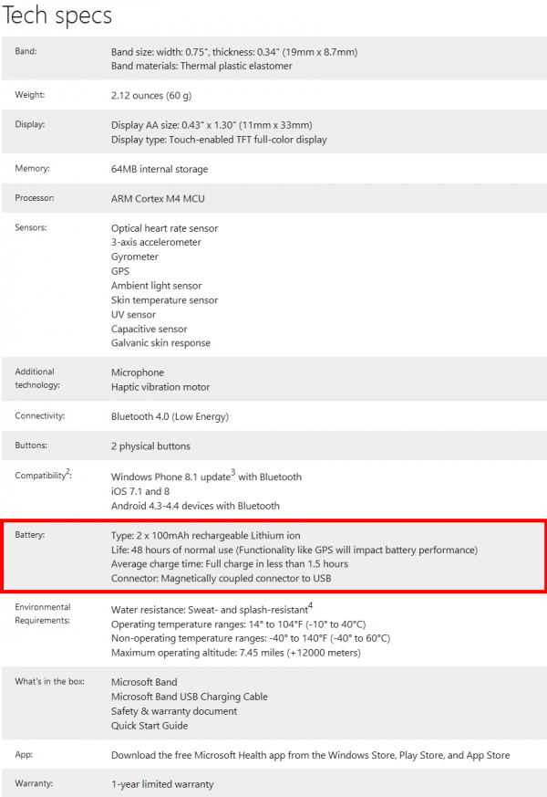 在充电方面微软表示Band智能腕带内置两个微型的105mAh容量电池,只需要90分钟就能完成充电,这意味着设备的功耗是非常低的。当然这只是官方提供的数据,外媒表示将会对其进行专业的测试,以便于得出实际的续航时间。