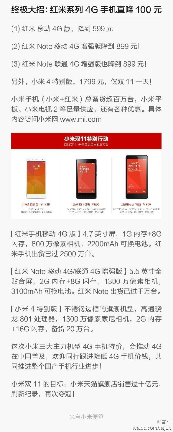 Helan 2014-11-10 09:49雷军公布了小米的双11神秘大招:红米系列产品全线降价。其中红米1S移动4G版降到599元,红米Note 4G增强版降到899元。对于降价前7日内在小米网和天猫小米官方旗舰店购买红米系列4G手机的用户可获得小米网100元现金券或天猫小米官方旗舰店100元店铺优惠券的补偿。