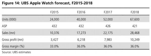 Steven Milunovich 提到,第一代 Apple Watch 有一些局限性,比如需要连接至 iPhone 才能正常工作。但是,他认为,第一代 Apple Watch 是苹果在可穿戴市场获得成功的重要一步。Steven Milunovich 认为 Apple Watch 的平均价格在420-430美元之间。这意味着苹果将获得103亿美元营收,设备的毛利润为33%。Apple Watch 将帮助苹果在2015财年获得34亿美元营收。