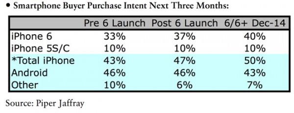 Helan 2014-12-24 10:22投资银行Piper Jaffray本月对美国1004名移动消费者进行了问卷调查,分析师Gene Munster表示尽管苹果在今年9月份推出的iPhone 6,但是当下依然有超过47%的受调查者表示将会在未来三个月内购买iPhone 6,作为比较iPhone 5S在相同时期则从50%下降到44%。