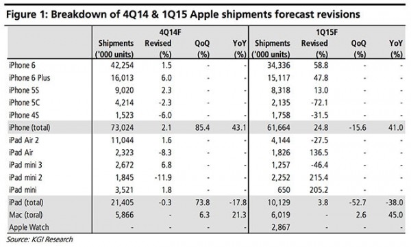 对于配备 Retina 显示屏的12寸 MacBook Air,郭明池认为苹果会在本季度发售。12寸 MacBook Air 采用全新超薄、超轻设计,搭载英特尔最新的芯片。受到新款 MacBook Air 和 MacBook Pro 的影响,苹果今年第一季度的 Mac 销量可能会达到600万。最后,郭明池认为苹果最近发布的 iPad Air 2和 iPad mini 3的销量会继续下滑,同比去年下降17.8%,销量可能只有2140万。