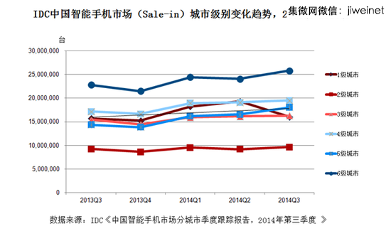 Helan 2015-01-27 09:261月26日消息,近日IDC最新发布的《中国智能手机市场分城市季度跟踪报告,2014年第三季度》显示,中国智能手机市场在第三季度Sale-in总量为1.05亿台,同比增长11.1%,环比增长1%。其中,1级城市环比下降16.8%,而4-6级城市无论同比还是环比均呈现上升趋势。