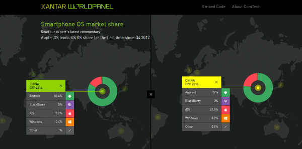 Helan 2015-02-05 09:09市场调研机构Kantar Worldpanel ComTech对来自全球超过60个国家的数据进行了综合分析,在最新公布的截至12月的2014年第四季度市场报告中显示大屏的iPhone 6/6 Plus获得了巨大成功,在美国、中国和欧洲高收入国家中的市场份额不断扩大,正蚕食Android市场的蛋糕。