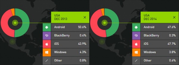 Kantar的首席分析师Carolina Milanessi表示:“在美国,自2012年以来苹果的iOS系统的市场份额首次超过Android,尽管只有0.1%。”当苹果决定满足市场发展趋势推出大屏iPhone,这无疑是正确的决定。