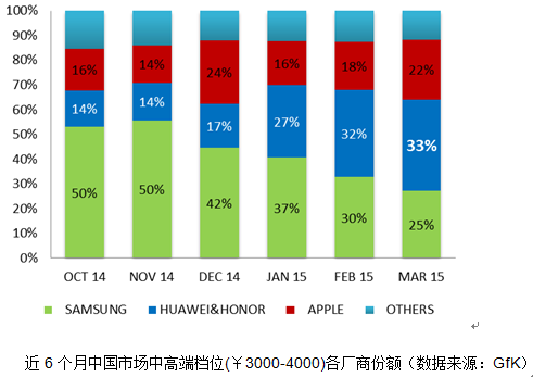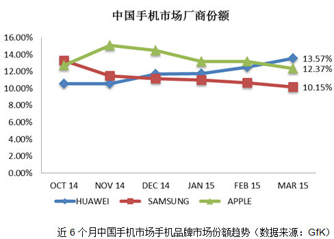 从数据变化可以看出:三星近6个月市场份额呈连续下降趋势;苹果自2014年11月市场份额达到顶峰之后也开始连续下滑;而华为继2014年12月在中国市场超越三星之后,又于2015年3月超越苹果,首次占据中国手机市场份额首位。
