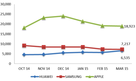 数据显示,在近6个月中,苹果销售额从2014年11月的181亿元,上升至2015年1月的241亿元,又回落至今年3月的189亿元。三星销售额从2014年11月的91亿元,下降至72亿元,呈现明显持续下滑趋势。而华为从45亿元上升至72.17亿元,连续6个月销售额持续上升,在3月已逼近三星。