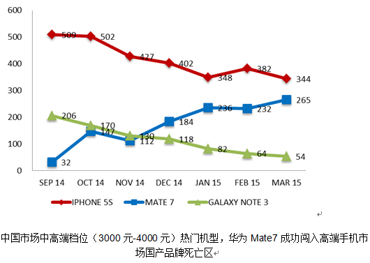 华为在3000-4000元价位获得市场份额提升的主要机型为2014年推出的Mate 7机型,从销量来看,Mate 7销量从2014年9月发布初期的3.2万部,上升至2015年3月的26.5万部,单月增幅达23.3万部。而同价格段苹果iPhone 5C机型单月销量从50.9万部下滑至34.4万部,三星Galaxy Note 3机型更是从20.6万部下滑至5.4万部。也就是说,以华为Mate 7为代表的国产手机品牌正取代三星成为3000-4000元价位的中坚机型。
