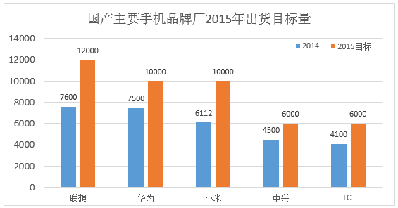 Helan 2015-07-13 11:102014年国内手机品牌厂华为、联想、小米等旗舰智能型手机向四核、八核升级逐渐增加在中高端市场的品牌影响力,并减少在低端市场的厮杀。2014年华为智能型手机销量达7500万台,同比增幅大于40%;联想智能型手机销量7600万台,同比增长50%;小米全年销量超过6000万,更是同比增长220%,TLC和中兴则维持在4500万的出货量。