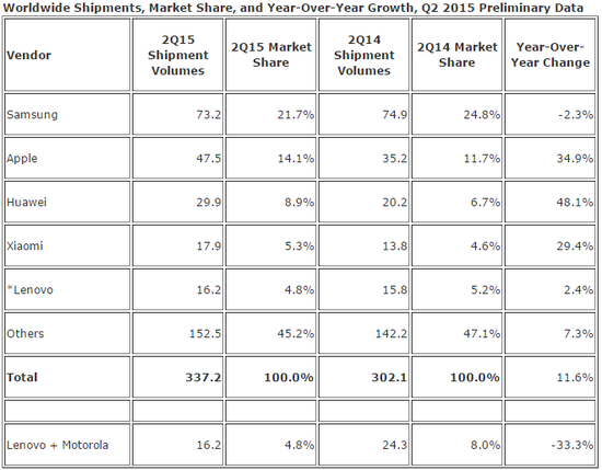 Q2全球智能机出货量三星位居第一
