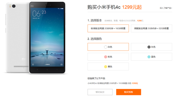 今天早上(9月23日)10:06分,编辑在小米官网看到小米4c已经有正式开卖页面,但小米4c的所有型号几乎已经被抢购一空,并处于“缺货登记”状态。低配1299元与高配1499元的白色版小米虽然也是贴出了“缺货登记”,但仍可进行“购买预售”,在未来的3~4周进行正式发货。