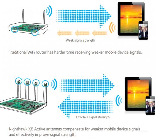 “为了增强覆盖和提升速度,Nighthawk X8还率先在业内使用了主动式天线,三频四路(hree Wi-Fi bands with quad-streams),1024 QAM,以及MU-MIMO等技术”。