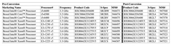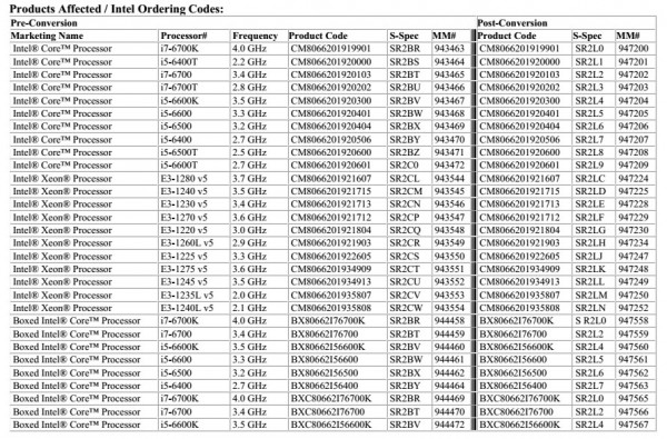 Intel表示,受影响的Skylake处理器主要集中在中高端,包括盒装和散片的i7\i5\E3-1200 v5系列。