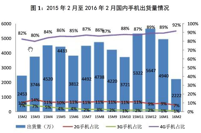 Helan 2016-03-14 11:47据工信部官微近日消息,最新统计数据显示,2016年2月,国内手机市场出货量为2222.3万部,同比下降9.4%。其中,4G手机出货量2036.2万部,同比增长0.8%,在全部手机同期出货量中的占比达到91.6%。数据同时显示,2016年2月,智能手机出货量为2054.2万部,同比下降6.1%,占同期国内手机出货量的92.4%,国产品牌手机出货量1917.3万部,同比下降10.9%,占同期国内手机出货量的86.3% 。