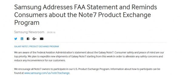 三星大度回应Note 7航空禁飞令:新版手机已出货